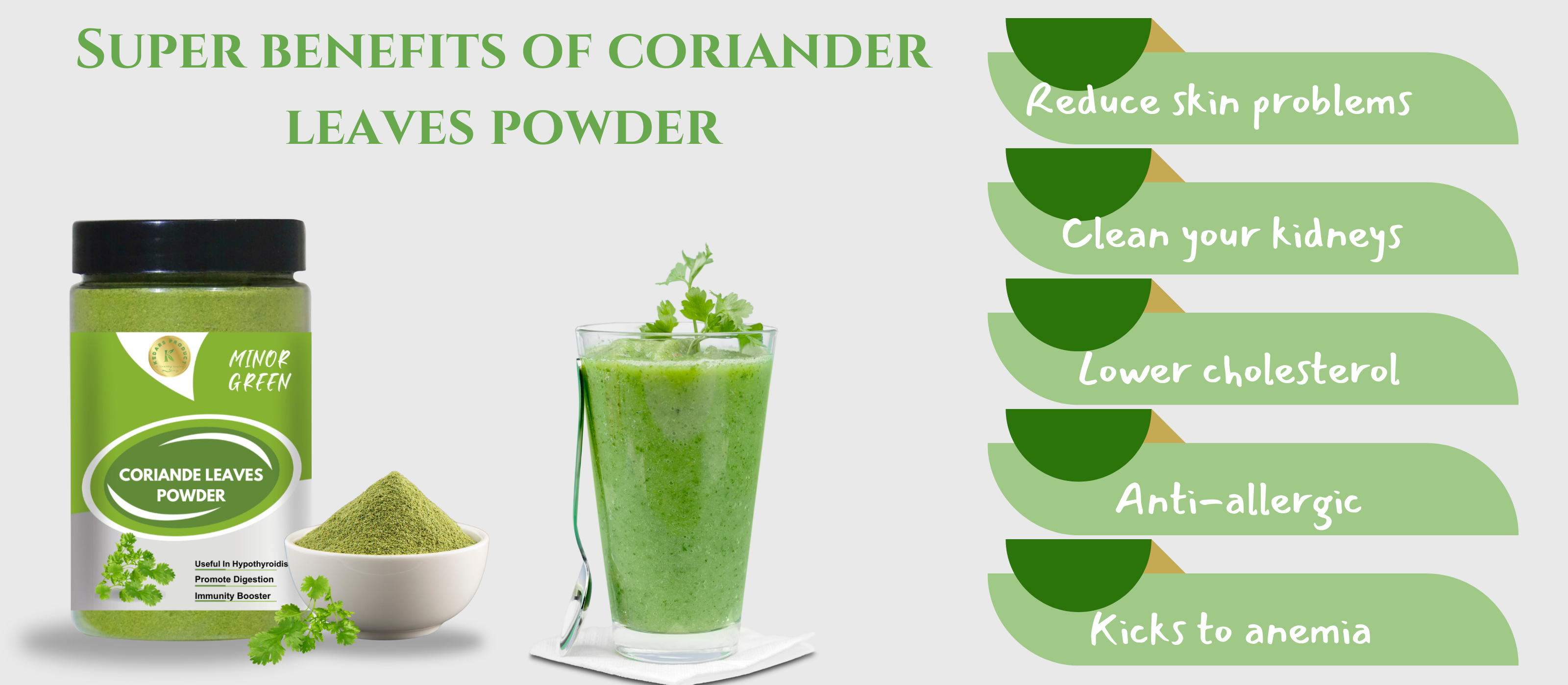 - Smoothies: Add a spoon of Kedars Product Dried Green coriander Leaves Powder in your smoothie/water & mix well ,add other ingredient for taste.