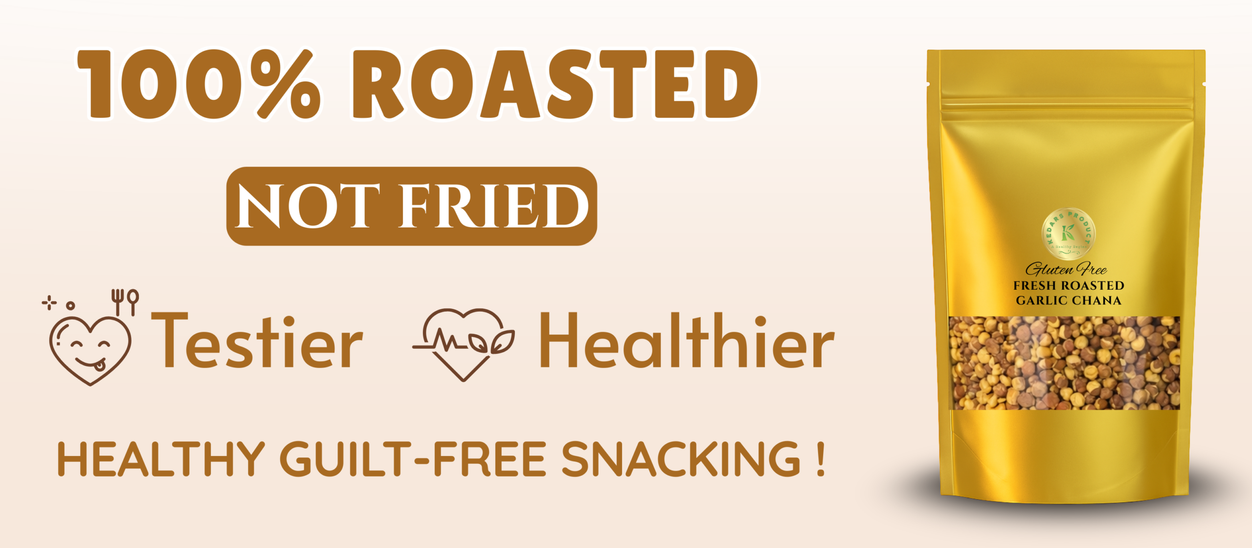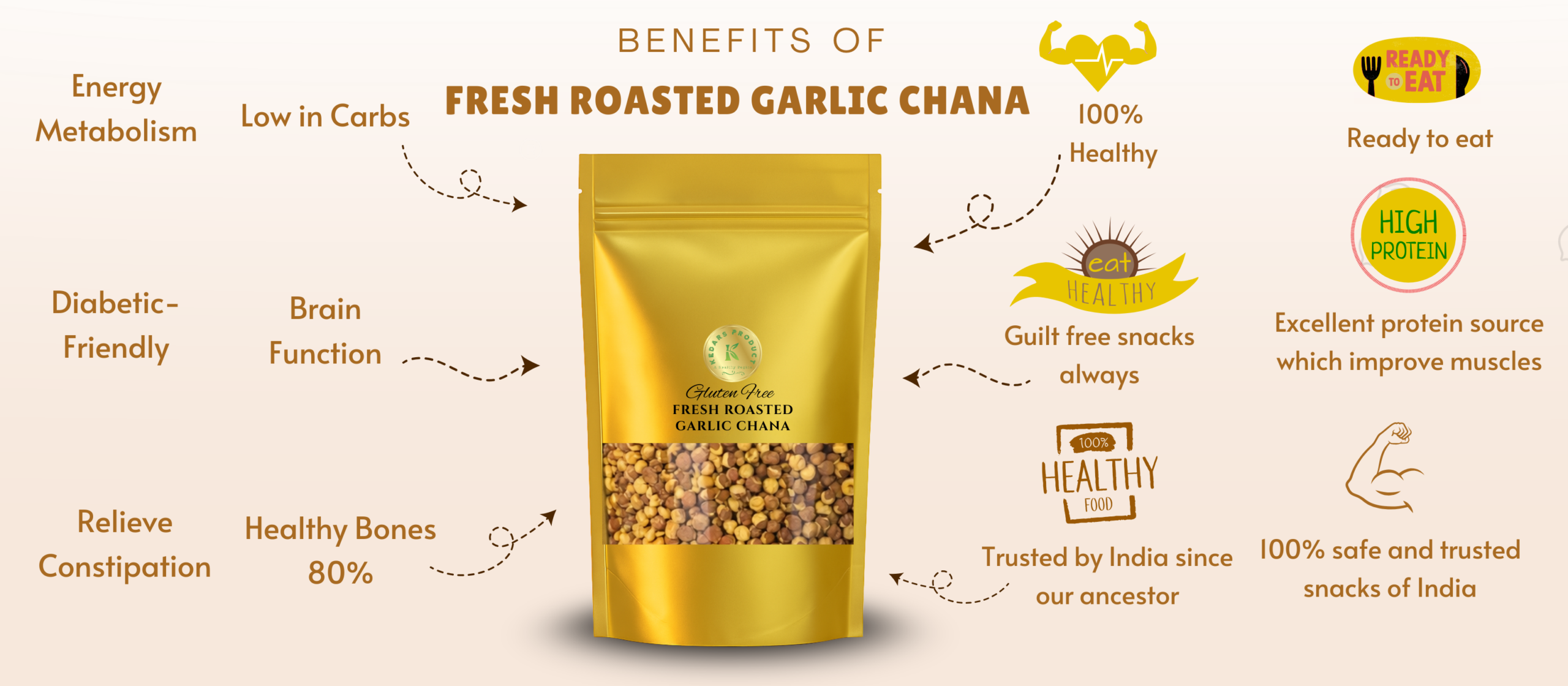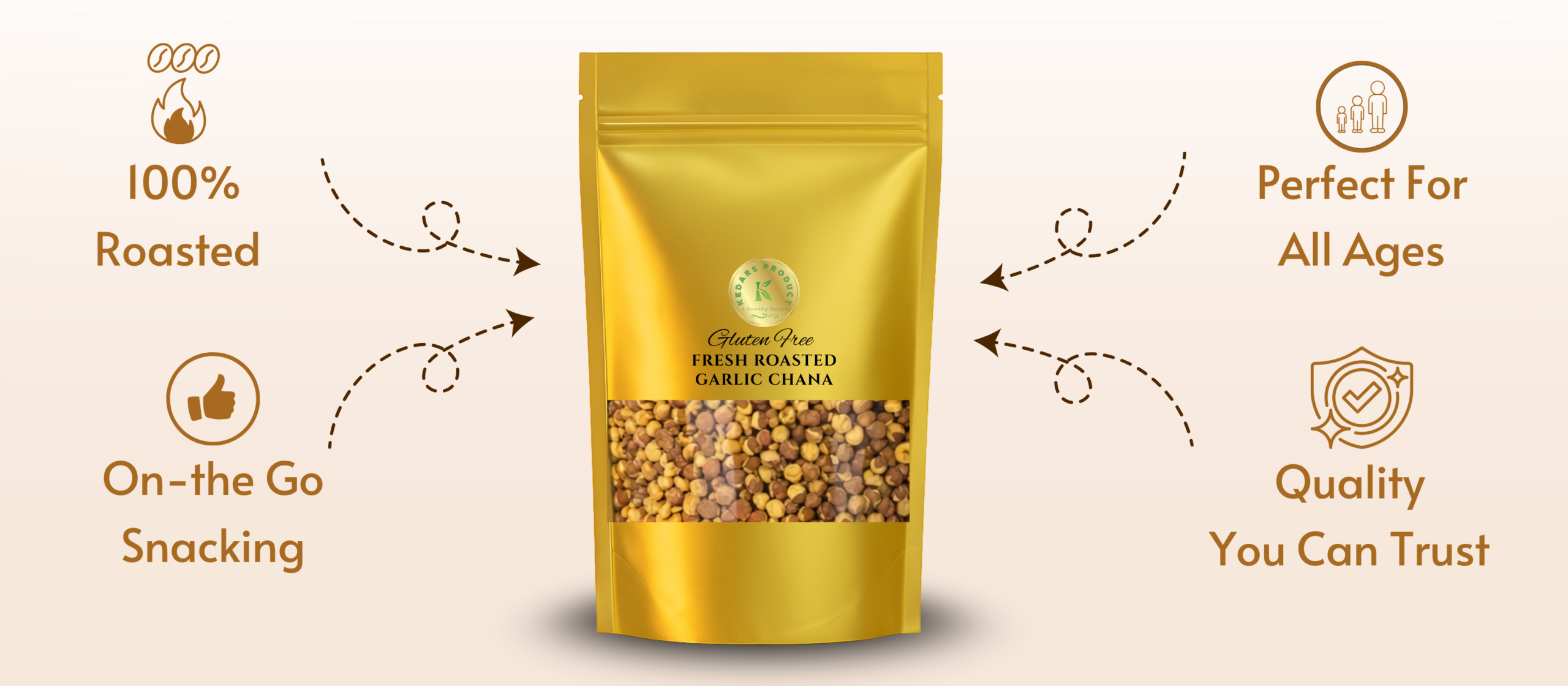 ⭐ “Freshly roasted chana seasoned with garlic, rich in protein and fibre, for a crunchy, filling, and healthy everyday snack.”