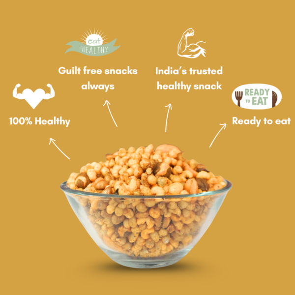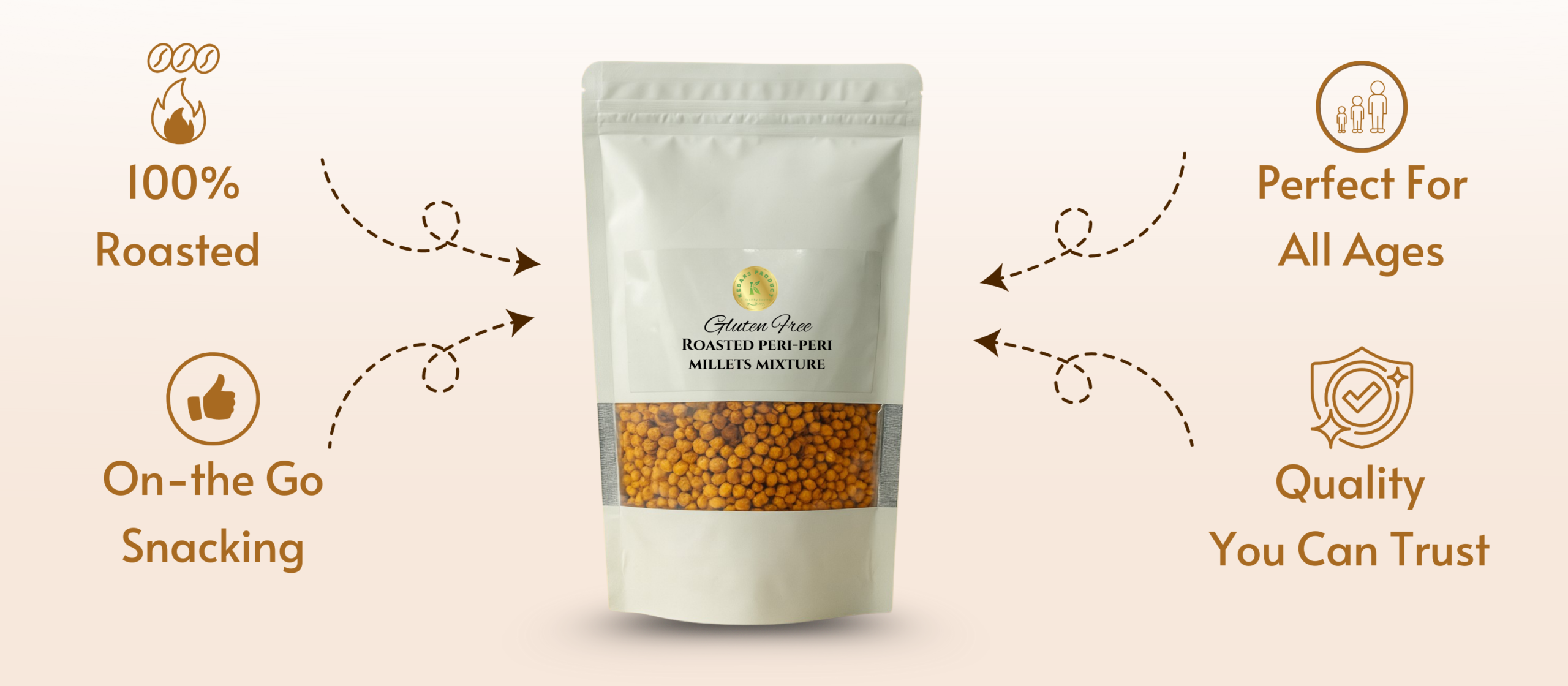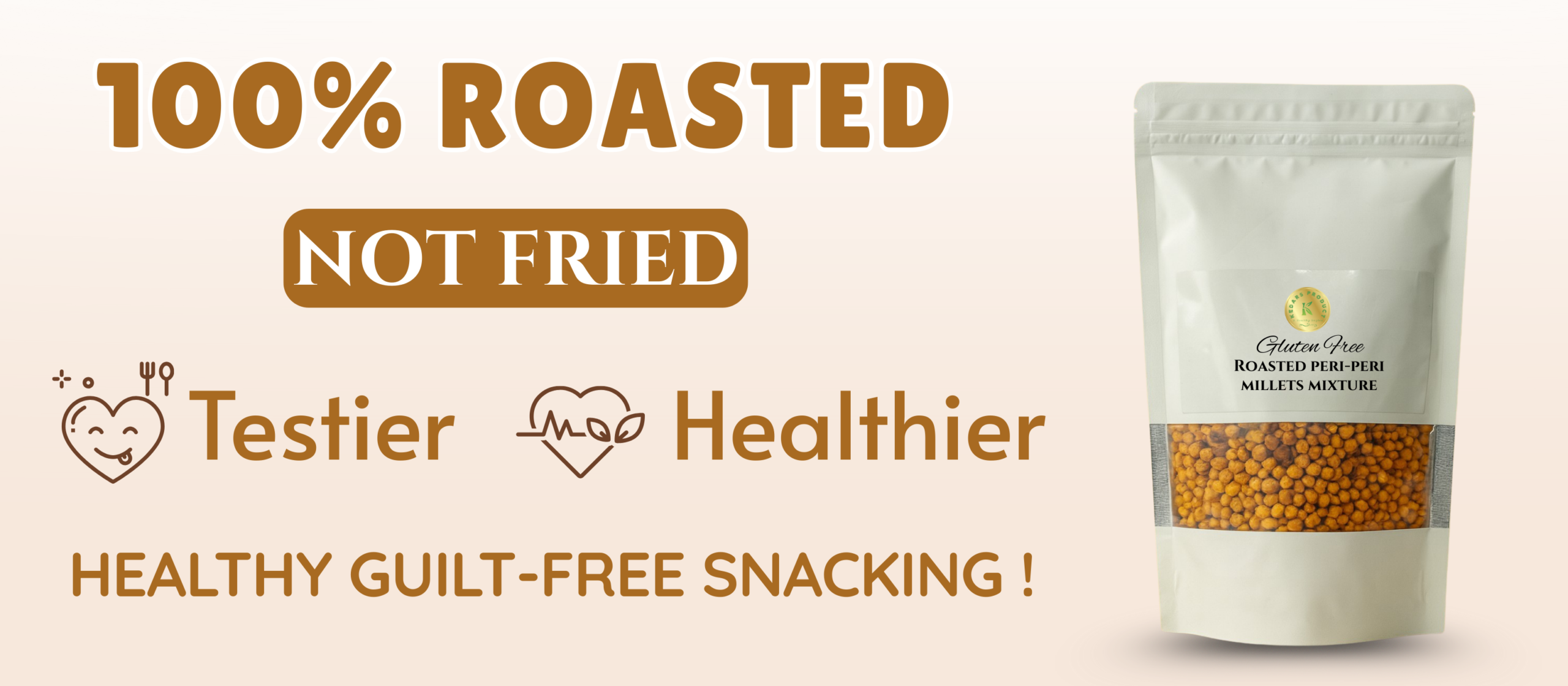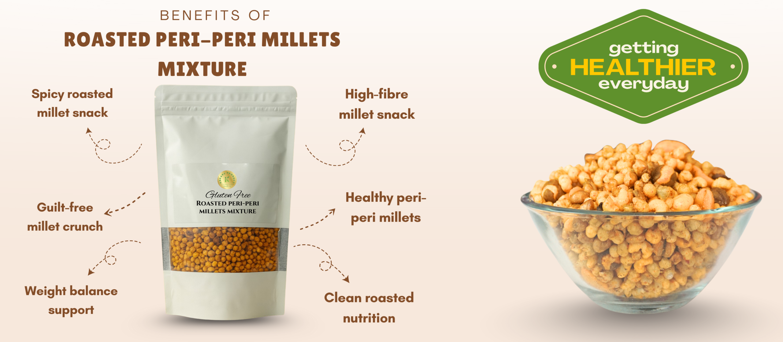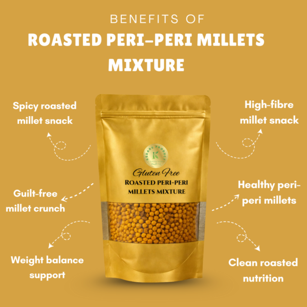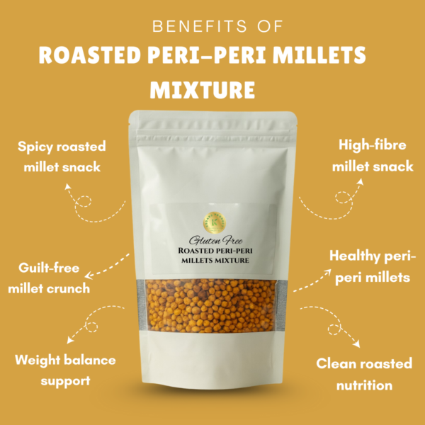 ⭐ “A spicy roasted millet mix rich in fibre, delivering crunchy taste, gut-friendly nutrition, and guilt-free snacking.”