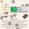 Pea protein isolate, Rice protein isolate, Diagestive blend, Cocoa powder,Vegan coconut milk powder, Natural chocolate flavour, stevia, Himalayan pink salt.
